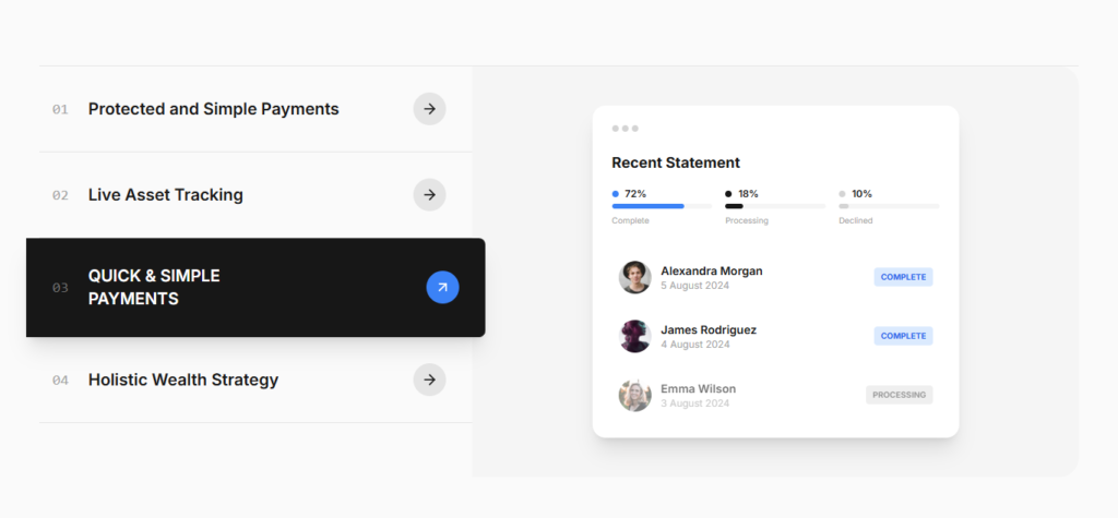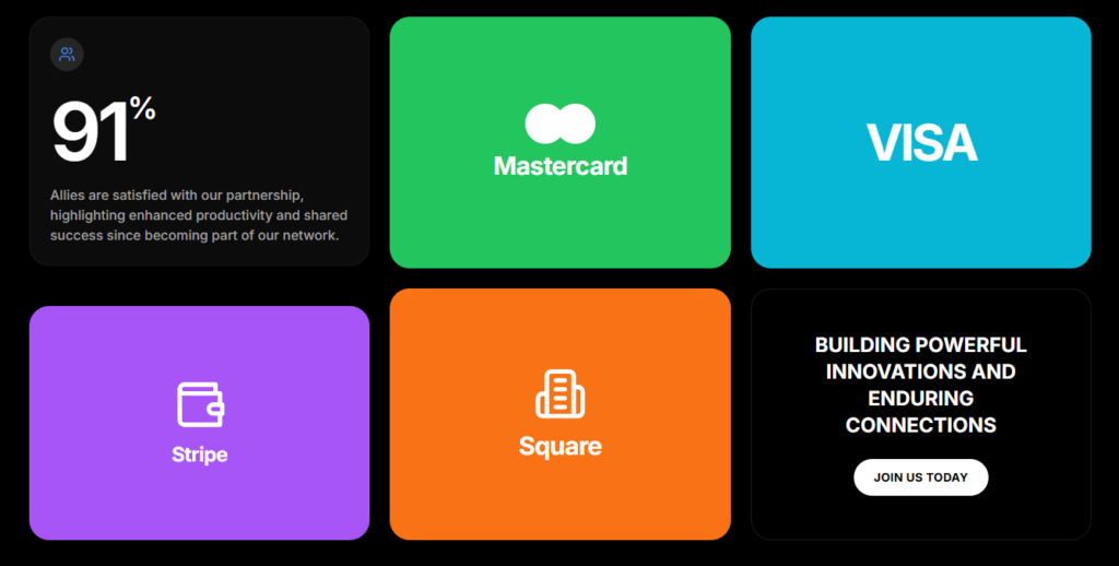 We delivered a cohesive, responsive landing page with SvelteKit and Tailwind. We structured content into clear sections—hero, stats, capabilities, benefits, partners, and testimonials—and used card mockups, bento grids, and a testimonial carousel to convey a premium, trustworthy product.