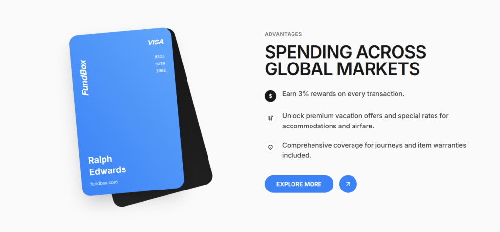 The FundBox landing page presents the brand as a serious wealth and payments platform. By combining a dark theme, blue accents, card visuals, and social proof (member counts, testimonials, partner logos), the site supports trust and encourages sign-up through a single, scrollable experience.