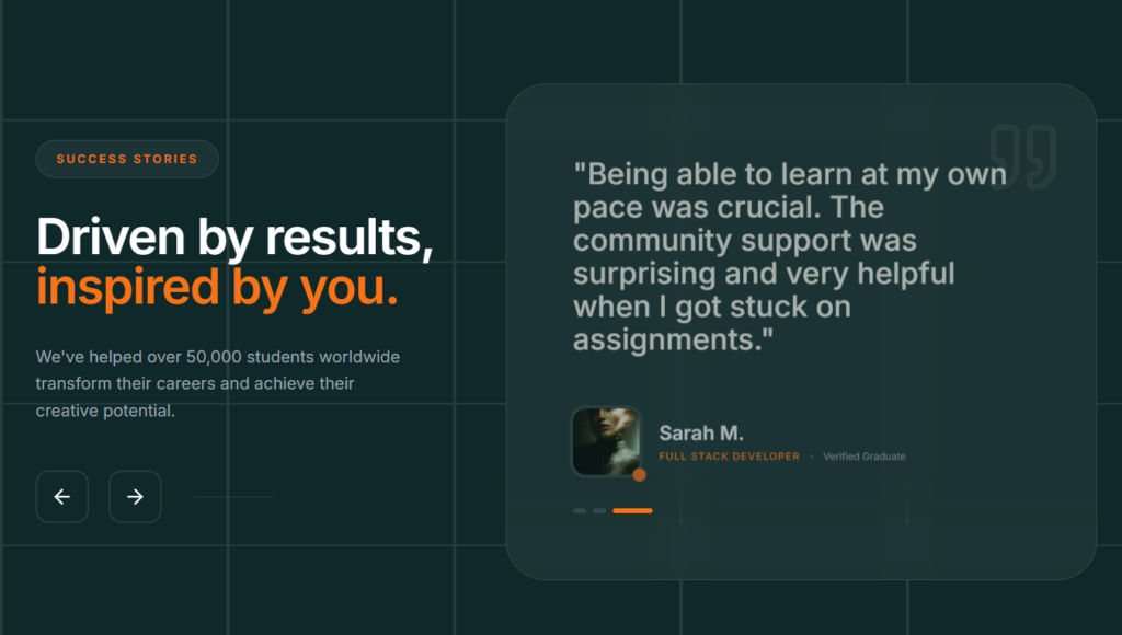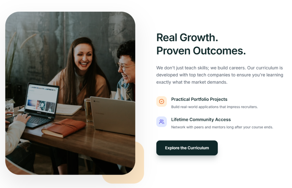 I designed and developed a responsive learning platform using SvelteKit with a clean, modern interface featuring intuitive course filtering, dynamic testimonials, and engaging visual elements.