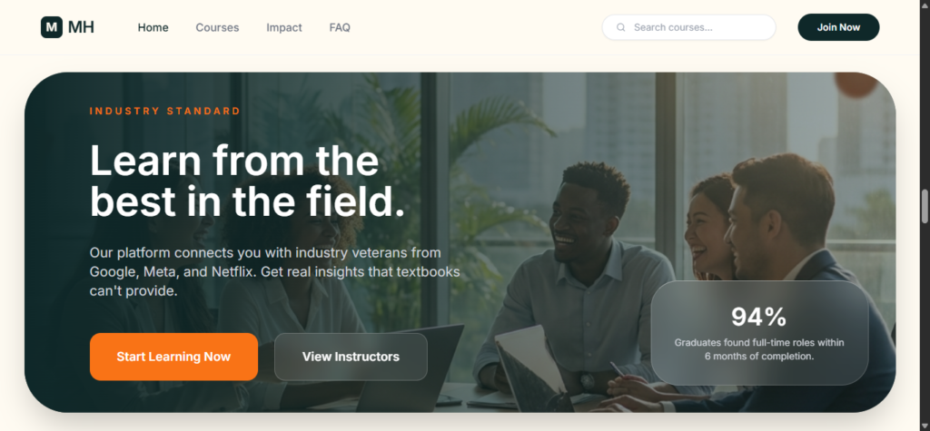 Online learning platforms often struggle with user engagement and course discoverability. Students need a modern, intuitive interface that helps them find relevant courses quickly while maintaining visual appeal.
